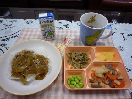 【本日のメニュー】カレー丼・枝豆、鶏肉とさといもの煮もの、ごぼうサラダ、パインアップル缶詰、米飯、牛乳でした。カレー丼というだけあって、少々和風の味付けでしたね。