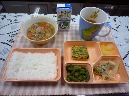 【本日のメニュー】中華煮、にらたま、いかと野菜の炒めもの、三度豆のピリ辛あえ、りんご缶詰、米飯、牛乳でした。中華煮は中華丼としてご飯にかけても良さそうですね。