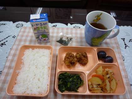 【本日のメニュー】鶏肉の竜田揚げ、赤平天とじゃがいもの煮もの、ほうれん草の磯辺あえ、ピオーネ、米飯、牛乳でした。