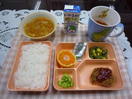 【本日のメニュー】ミラノ風カツレツ、ミネストローネ・枝豆、三度豆のサラダ、みかん、米飯、牛乳でした。大阪市・ミラノ市の姉妹都市提携35周年記念のミラノ・フェア開催中。