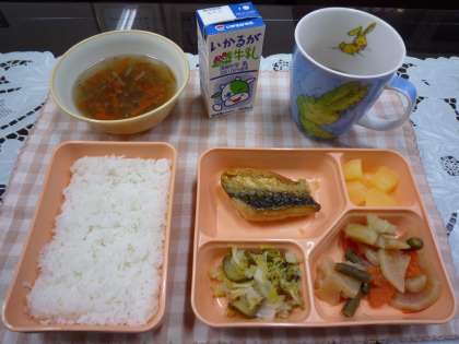 【本日のメニュー】鯖のみそ煮、じゃがいもとだいこんの煮もの、はくさいときゅうりの酢のもの、りんご缶詰、吉野汁、米飯、牛乳でした。
