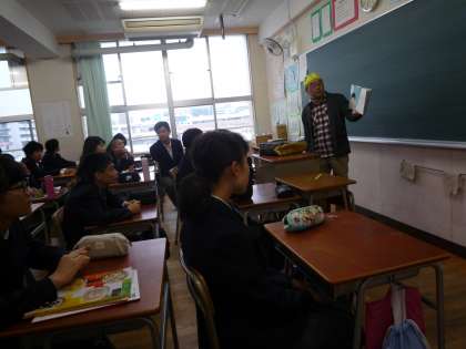 本日、元気アップ・ボランティアの皆さんによる定例の絵本読み聞かせが行われました。この2学期からはネイティブのスティーブンさんだけではなく、英語と日本語交じりで絵本を読んでくださっている方もいます。