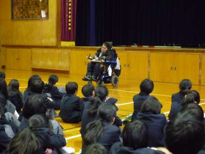 本日の1年生の6限目は、毎年来てくださっている小西さんの福祉講話をお聞きしました。お話の後は、電動車いすで生活されている小西さんに、生徒たちからいろいろな苦労や今後の夢について質問がありました。