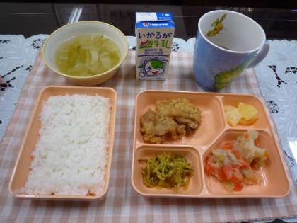 【本日のメニュー】フライドチキン、ウインナーと野菜の洋風煮、野菜(もやし)のカレー炒め、パインアップル缶詰、キャベツスープ、米飯、牛乳でした。今日は2年生が遠足でいませんので、1、3年生のみ給食でした。