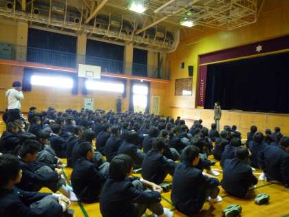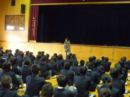 本日の1年生の学年集会では、支援学級担当の松井先生からのお話がありました。支援学級にいる友達への理解、宮原中の民族学級の成り立ちと存在意義、そして12/1の民族学級発表会に向けて「民族学級応援隊」への参加を呼び掛ける内容でした。