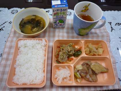 【本日のメニュー】鶏肉のてり焼き、豚肉と野菜の炒めもの、じゃがいもの煮ころがし、かぶの甘酢づけ、(ワカメ・うす揚げ)みそ汁、米飯、牛乳でした。