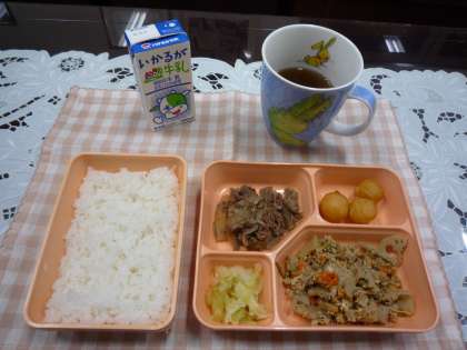 【本日のメニュー】豚肉とれんこんの炒めもの、牛肉すき焼き風、揚げポテトもち、キャベツの甘酢あえ、米飯、牛乳でした。