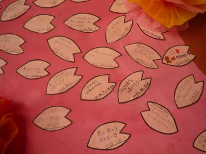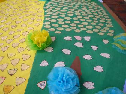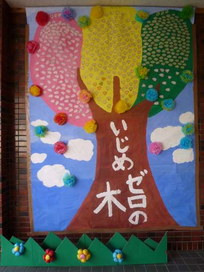 今年は、教職員も含む全員で葉っぱと花びらに自分の行動宣言を書きました。「傍観者から仲裁者に」という本校のいじめ撲滅意識が、この「いじめゼロの木」のように大きく花開いてほしいと思います。