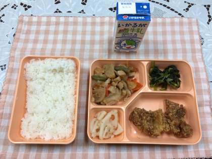 【本日のメニュー】鶏肉のから揚げ、赤平天とだいこんの煮もの、小松菜のおひたし、れんこんの酢のもの、米飯、牛乳でした。