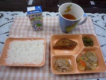 【本日のメニュー】赤魚の竜田揚げ、豚肉と野菜の煮もの、だいこんのそぼろ煮、じゃことピーマンの炒めもの、米飯、牛乳でした。純和風の日でした。
