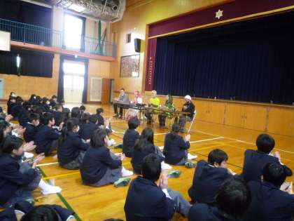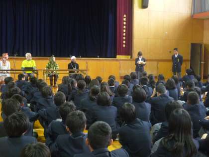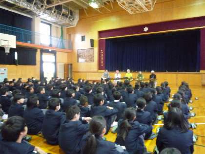 6時間目は全員が体育館に集まり、各学級での事前学習(調べ学習)の内容と今日、聞いた内容の発表、そして、来ていただいた講師の皆さんに質問をしました。