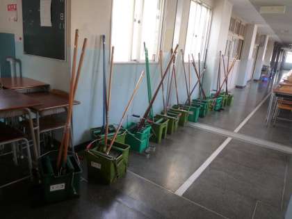 明日の終業式を控えて、今日は学校中をピカピカに大掃除。そして、机を廊下に出して、教室の床のワックスがけも行いました。