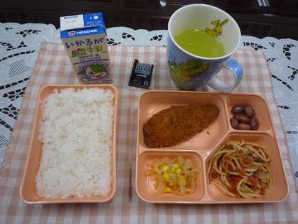 【本日のメニュー】サーモンチーズフライ、スパゲッティソテー、だいこんとコーンのドレッシングあえ、金時豆のグラッセ、米飯、牛乳でした。