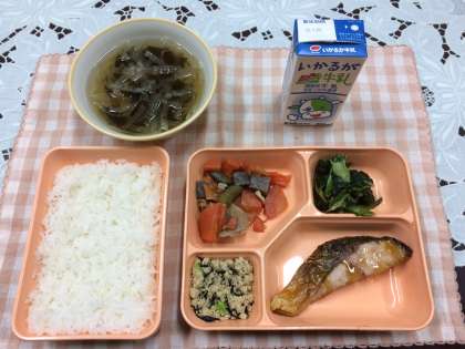 【本日のメニュー】鰤のてり焼き、鶏肉とこんにゃくの煮もの、小松菜のおひたし、高野どうふのいり煮、すまし汁、米飯、牛乳でした。