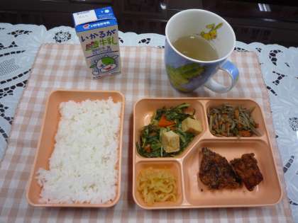 【本日のメニュー】鶏肉の竜田揚げ、あつあげとおおさかしろなのみそ煮、きんぴらごぼう、たくあん、米飯、牛乳でした。