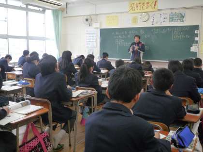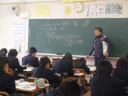 本日の研究授業は1年生対象です。まず、学年主任上山先生の社会科は、平安時代の新しい仏教(最澄、空海らがもたらした密教)と仮名の誕生を取り上げ、国風文化について学ぶ単元でした。淡々と面白いエピソードが混ざる上山節で、歴史好きの生徒が増えてくれればと思います。