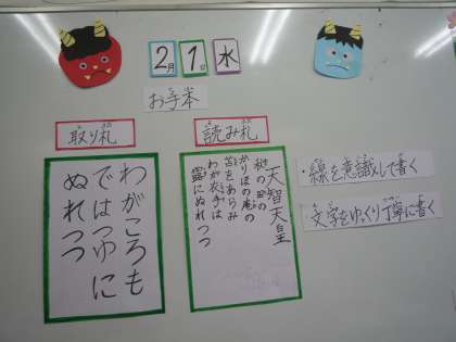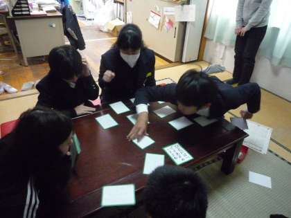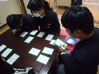 今日の授業は3年生と1年生の合同で行う国語です。先日、1年生の百人一首大会に参加できなかった生徒も、がんばって和歌を覚えました。読み札も取り札も自分たちで作った手作り百人一首です。さて、誰が何枚取れるかな?