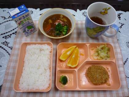 【本日のメニュー】ビーフシチュー・ブロッコリー、ミンチカツ、キャベツのピクルス、いよかん、米飯、牛乳でした。今が旬の「いよかん」は愛媛県の特産品です。