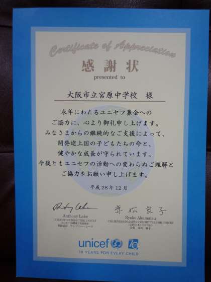 また、昨年の募金活動に対して、ユニセフ協会から感謝状もいただきました。