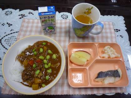 【本日のメニュー】ビーフカレーライス・枝豆、白身魚のムニエル、カリフラワーのピクルス、りんご、米飯、牛乳でした。