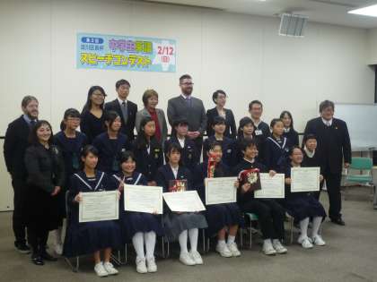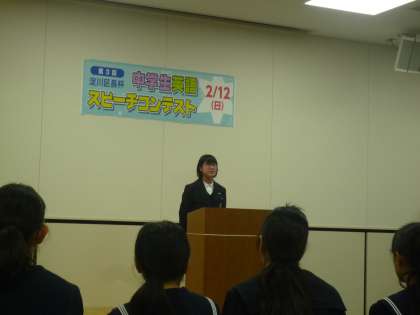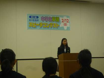 2月12日(日)、淀川区役所において「第3回淀川区長杯中学生英語スピーチコンテスト」が行われました。本校からも3人の出場者が大健闘しました。そして、毎年、十三中学校が独占していた「優勝・2位・3位」の壁を本校の2年生、前田さんが打ち破りました。表彰式では、第2位の賞状と楯を淀川区の榊区長から授与されました。