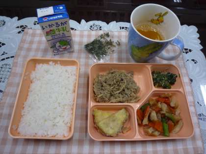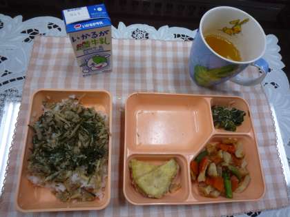 【本日のメニュー】鶏ごぼうご飯、赤平天とだいこんの煮もの、さつまいものてんぷら、ほうれん草ともやしのおひたし、米飯、牛乳でした。鶏ごぼうと刻みのりを載せて(2枚目の写真)食べます。
