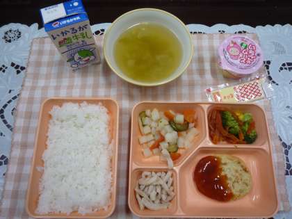 【本日のメニュー】とうふハンバーグ、ポテトサラダ・ハム、ブロッコリーの甘辛あえ、いちごのムース、ベーコンとキャベツのスープ、米飯、牛乳でした。