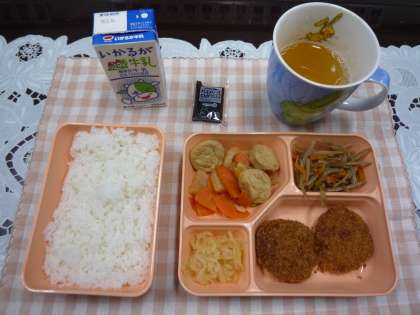【本日のメニュー】一口ヒレとんかつ、一口がんもとだいこんのみそ煮、きんぴらごぼう、たくあん、米飯、牛乳でした。