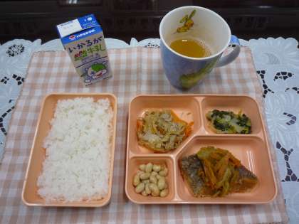 【本日のメニュー】白身魚のカレーあんかけ、豚肉と野菜の炒めもの、ほうれん草とはくさいのごまあえ、大豆とこんぶの煮もの、米飯、牛乳でした。