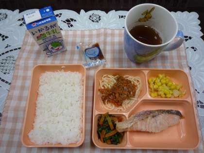 【本日のメニュー】鮭のムニエル、ミートソーススパゲッティ、キャベツとコーンのサラダ。ほうれん草のソテー、米飯、牛乳でした。