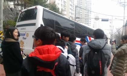 バスを見送る三角山中学校の生徒、先生方、本当にありがとうございました。