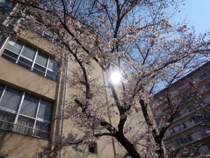 玄関前の大きな桜も六分咲き。明日の新入生を待っています。