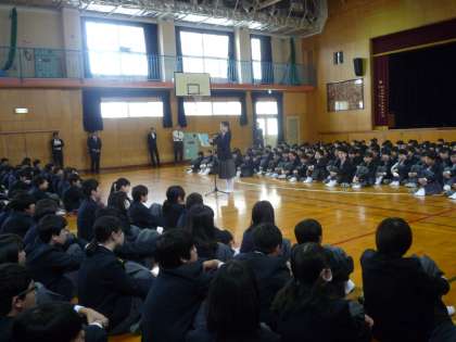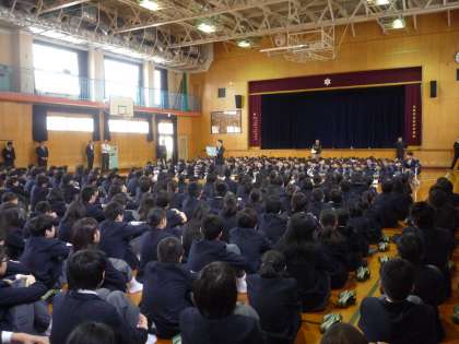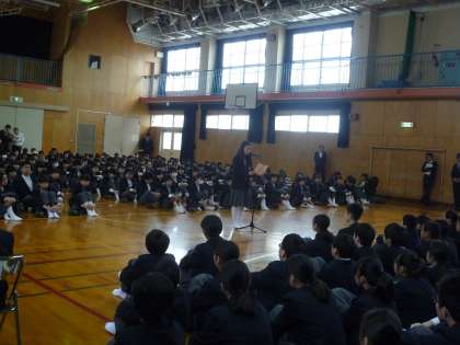 始業式に引き続いて、新入生と新2,3年生の対面式が行われました。先輩からの歓迎のことば、新1年生の誓いのことばが、それぞれ学年代表から述べられて、1年生は2年生、3年生の拍手に送られて退場しました。