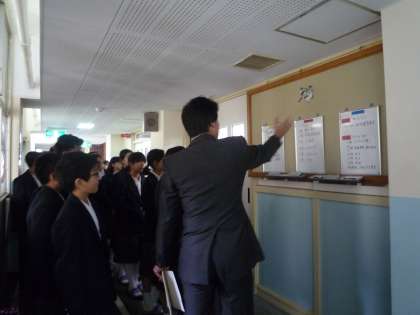 1年生は、給食の後の5時限目に、それぞれの担任の先生に連れられて校内を見学して回りました。学校生活に必要な掲示板や各教室・部屋の位置などを確認しました。その後は「大清掃」の時間です。掃除を担当する場所や掃除の仕方を学びました。
