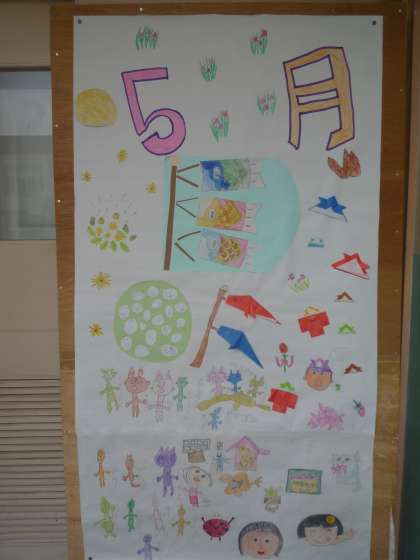 お待たせしました。連休明けに特別支援学級5月の看板ができました。今月のテーマは「子どもの日」と「母の日」です。何故か戦隊ヒーロー群には「桃太郎・金太郎・浦島太郎」の「三たろにゃん」もいます。