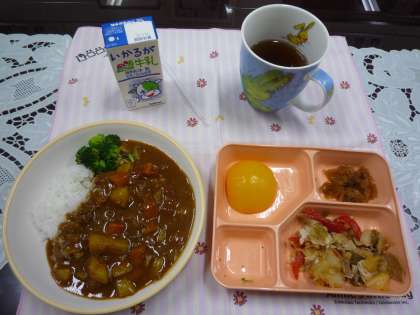 【本日のメニュー】ミートカレーライス・ブロッコリー、豚肉と野菜のバーベキューソース炒め、福神漬け、黄桃缶詰、米飯、牛乳でした。