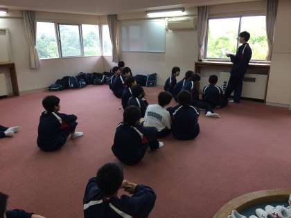 昼食を済ませ、午後のプログラムに入ります。予定していたオリエンテーリングは中止となりました。代わりに、クラスごとに、体育大会の出場種目決めと校歌コンクールの練習を行います。
