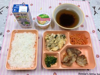 【本日のメニュー】豚肉のウチテーてんぷら、豆腐チャンプルー、にんじんシリシリ、シークワーサーゼリー、もずくのすまし汁、みつば、米飯、牛乳でした。
