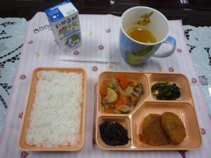 【本日のメニュー】みそカツ、肉じゃが、小松菜のおひたし、のりの佃煮、米飯、牛乳でした。