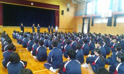 いよいよ修学旅行当日となりました。お天気にも恵まれ、予定していた生徒全員7時に集合し、体育館での出発式を行いました。