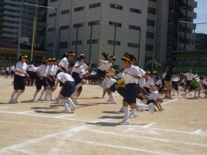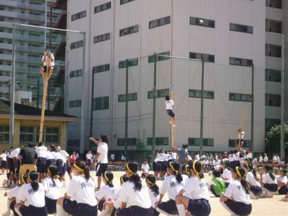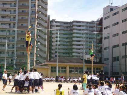 2年生の学年種目「富士山登頂と台風の目」です。女子の動きもスムーズで、男子にバトンタッチ。男子の上るスピードもすばらしい!
