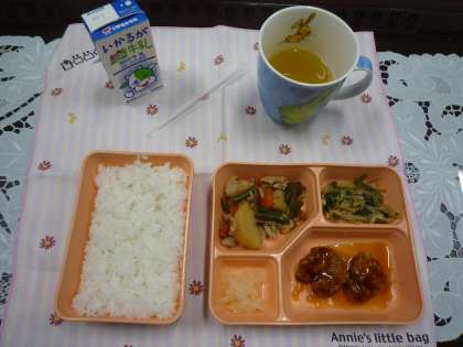 【本日のメニュー】豚肉の甘辛だれかけ、鶏肉とじゃがいもの煮もの、ほうれん草ともやしの炒めもの、だいこんの甘酢あえ、米飯、牛乳でした。
