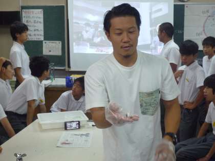 今日の2年生の理科は、豚の目玉の解剖をしました。今までの体の仕組み、眼球内外の機能の復習をした後、まずは東谷内先生がお手本の解剖をしました。生徒はおっかなびっくり目玉や中の水晶体(レンズ)を触って、その感触も得ました。その後は代表生徒が実際に解剖を体験して、全員で感想レポートを書きました。
