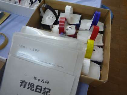 今年も3年生は、玉子を赤ちゃんに見立てた子育てに挑戦しています。綿花に包まれた玉子ちゃん(名前も顔もあります)を毎朝、学校(保育園)に預けて、下校時には家に連れて帰って世話をします。育児日記に毎日の変化(本当の赤ちゃんの成長に合わせた観察日記)を付けます。土・日曜日は家庭でいろいろなハプニングが起こるので、それに対処した記録も付けます。