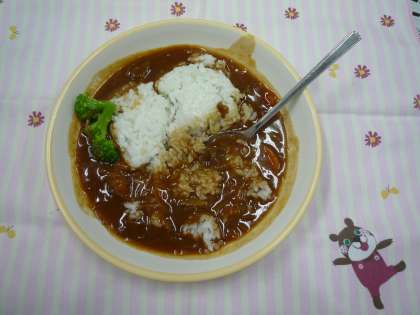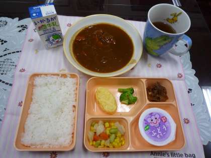 【本日のメニュー】ハヤシライス、オムレツ、ボイルブロッコリー、じゃがいもの洋風煮、福神漬け、ぶどうゼリー、米飯、牛乳でした。ハヤシライスはご飯にかけて食べます。(2枚目写真)
