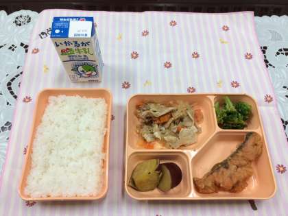 【本日のメニュー】豚肉のしょうが焼き、鮭のから揚げ、さつまいもの甘煮、ブロッコリーのごまあえ、米飯、牛乳でした。