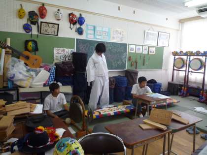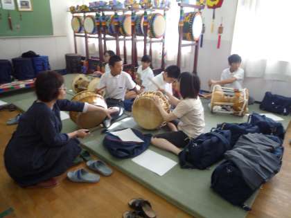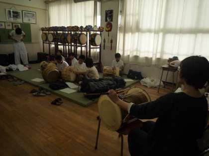 国際クラブでは、一生懸命「サムルノリ」の練習をしています。「民族学級応援隊」も音響や照明でお手伝いに来てくれています。