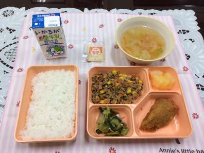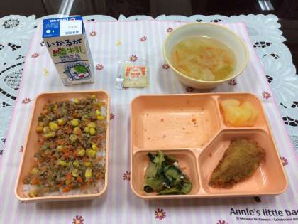 ミートピラフ、サーモンフライ、ベーコンとチンゲンサイのソテー、パインアップル缶詰、スープ、米飯、牛乳でした。