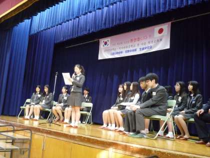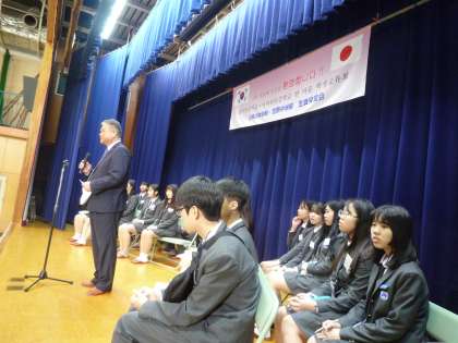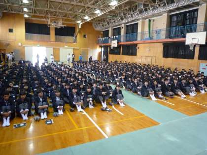 各家庭でホームステイを体験した三角山中学校の生徒は、本校生徒と共に登校。臨時全校集会でみごとな英語と日本語でスピーチしてくれました。
