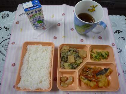 【本日のメニュー】白身魚の野菜あんかけ、あつあげと根菜の煮もの、はくさいときゅうりのおひたし、白花豆の煮もの、米飯、牛乳でした。
